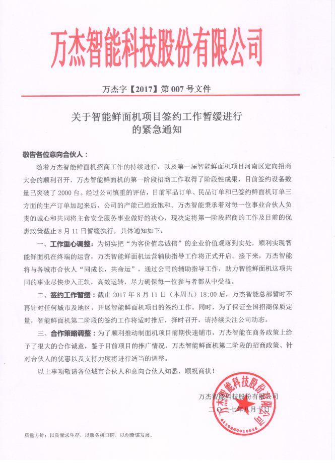 敬告各位意向合伙人: 隨著萬杰智能鮮面機招商工作的持續(xù)進行,以及第一屆智能鮮面機項目河南區(qū)定向招商大會的順利召開,萬杰智能鮮面機的第一階段招商工作取得了階段性成果,目前簽約設(shè)備數(shù)量已突破了2000臺。經(jīng)過公司慎重的評估,目前軍品訂單、民品訂單和已簽約鮮面機訂單三方面的生產(chǎn)訂單加起來后,公司的產(chǎn)能已趨近飽和。萬杰智能秉承著對每一位事業(yè)合伙人負責(zé)的誠心和共同將主食安全服務(wù)事業(yè)做好的決心,現(xiàn)決定將第一階段招商的工作及目前的優(yōu)惠政策截止8月11日暫緩執(zhí)行,具體通知如下: 一、工作重心調(diào)整:為切實把“為客價值忠誠信”的企業(yè)價值觀落到實處,順利實現(xiàn)智能鮮面機在終端的運營,萬杰智能鮮面機運營輔助指導(dǎo)工作將正式開啟。接下來,萬杰智能將與各城市合伙人“同成長,共命運”,通過公司的輔助指導(dǎo)工作,助力智能鮮面機這項共同的事業(yè)盡快步入正軌,高效運轉(zhuǎn),盡力確保每一位參與者都從中受益。 二、簽約工作暫緩:截止2017年8月11日(本周五)18:00后,萬杰智能總部暫時不再針對任何城市及地區(qū),開展智能鮮面機項目的簽約工作。同時,為了保證全國招商保質(zhì)定量,智能鮮面機第二階段的簽約工作將適時推后,擇時召開,請持續(xù)關(guān)注公司動態(tài)。 三、合作策略調(diào)整:為了順利推動制面機項目前期快速鋪市,萬杰智能在商務(wù)政策上給予了很大的合作誠意,鑒于目前項目的推廣情況,萬杰智能鮮面機第二階段的招商政策、針對合伙人的優(yōu)惠以及支持力度將進行適當(dāng)?shù)恼{(diào)整。 以上事項敬請各位城市合伙人和意向合伙人知悉,順祝商祺!
