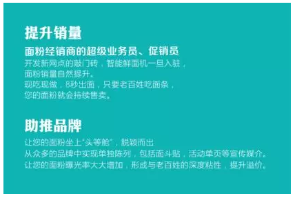 智能鮮面機可以成為糧油經(jīng)銷商伙伴們開發(fā)新網(wǎng)點的敲門磚,智能鮮面機入駐了,面粉銷售自然就提升了。