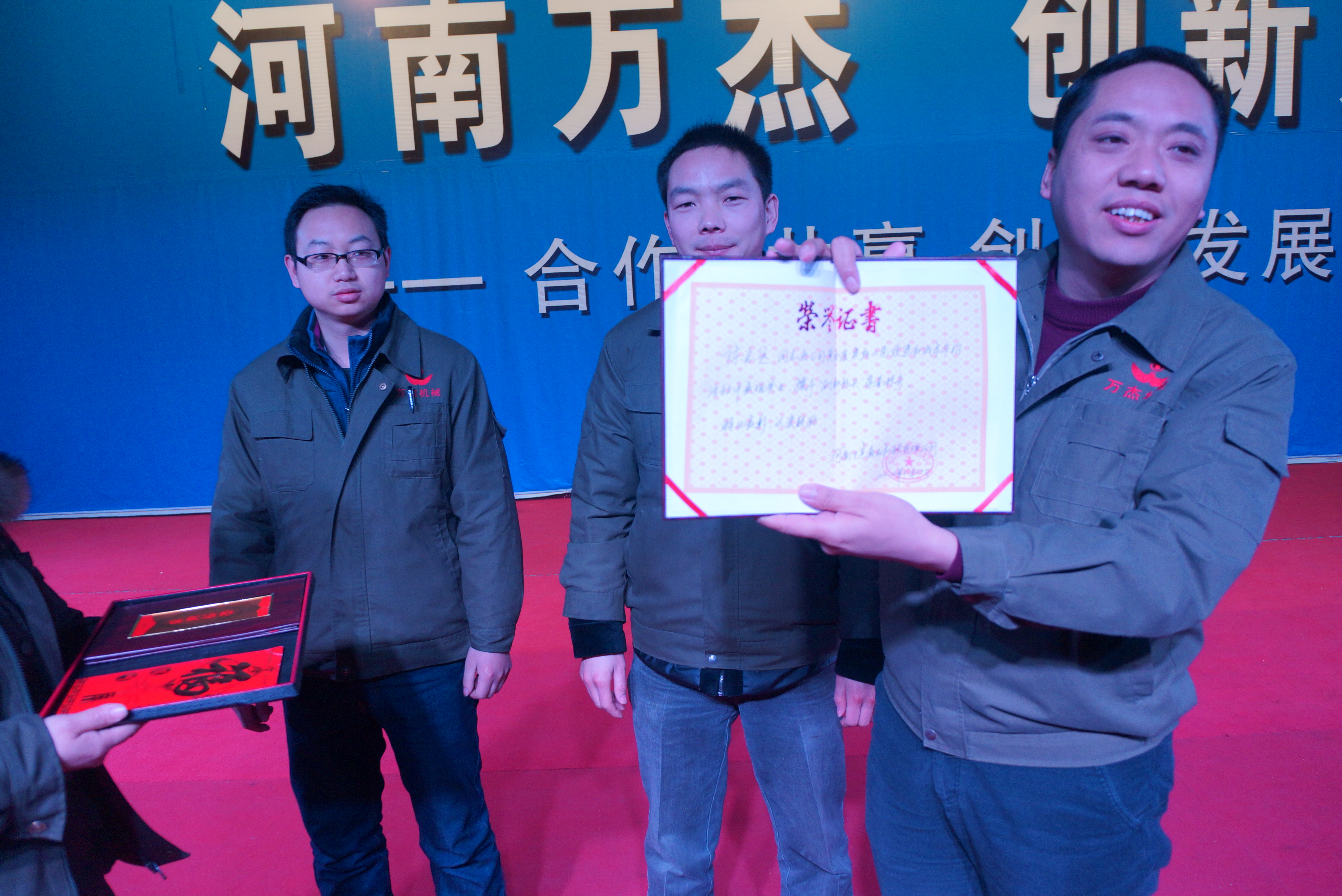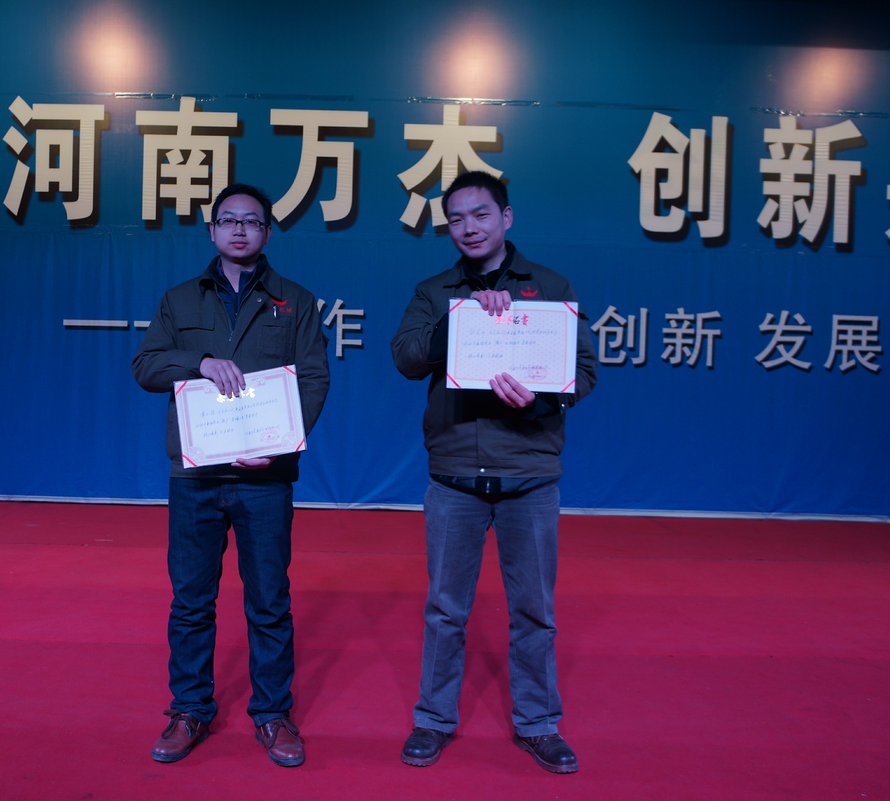 2013年12月30日,公司在二樓演播大廳再次召開了表彰大會(huì),授予品保部陳志遠(yuǎn)同志“創(chuàng)新標(biāo)兵”榮譽(yù)稱號(hào)、授予品保部常玉強(qiáng)同志“榮耀之星”榮譽(yù)稱號(hào),對(duì)黃金層蒸房改善小組獎(jiǎng)勵(lì)現(xiàn)金1000元。董事長(zhǎng)親自為其頒發(fā)榮譽(yù)證書和獎(jiǎng)金。